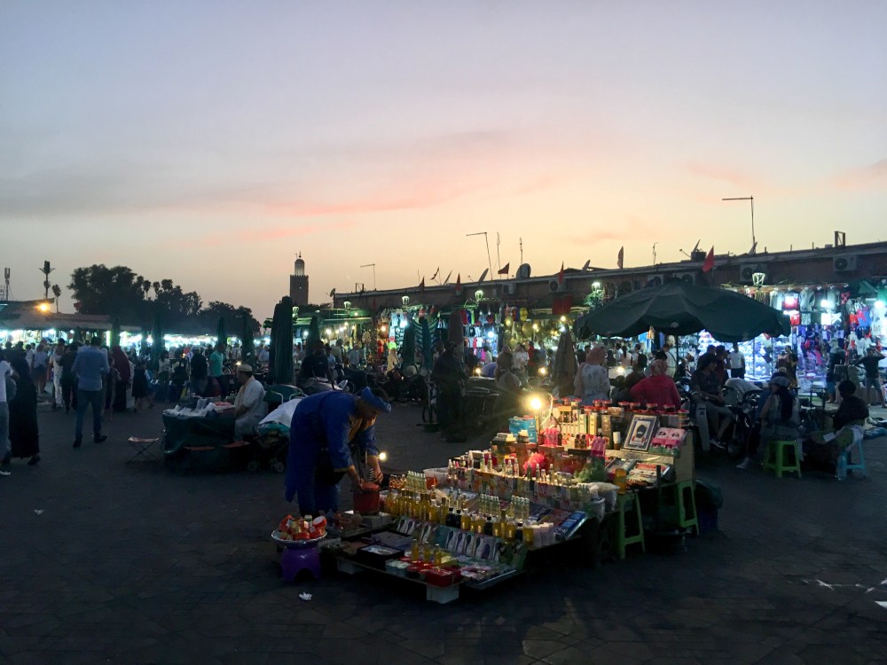 Die Abende habe ich übrigens entweder in meinem Riad auf der Terrasse oder auf dem Djeema El Fna verbracht – hier wird der Platz buchstäblich in ein anderes Licht getaucht, sobald die Dämmerung einsetzt. Wie aus dem Nichts tauchen jede Menge Garküchen und Gaukler auf, und gefühlt trifft sich hier abends auch sonst ganz Marokko. Am besten und entspanntesten beobachtest du das Treiben von der Terrasse eines der umliegenden Cafés und Restaurants.